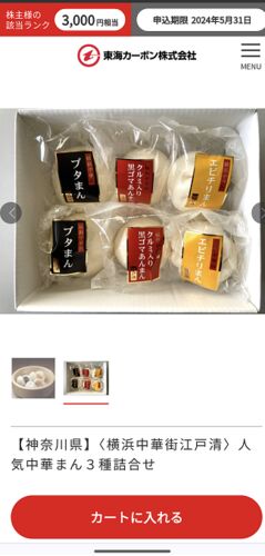 とある日の 株主優待品 東海カーボン(5301)さんの株主優待品です。 息子君が100株ほど保有しています。 株主優待品は1年以上3年未満継続保有100株で2,000円相当、3年以上で3,000円相当のお品をいただけます。 今年は中華まん詰め合わせを…