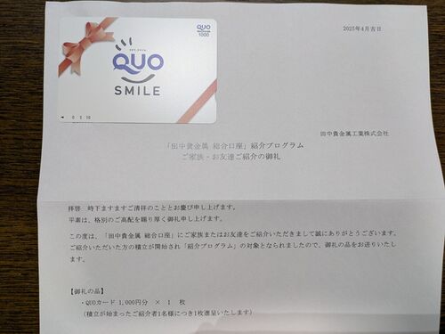 とある日の お届け物 田中貴金属さんからお友達紹介プログラムからクオカードを頂きました! 当ブログの下部から「田中貴金属の純金積立」をはじめられた方がいらっしゃったのですね。貯金(ちょゴールド)の仲間として一緒に頑張りましょう~ 世界はリスク…